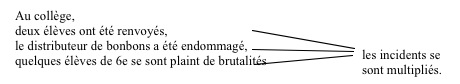 Ex. : Avant de rentrer chez soi, on peut égarer ses clefs de voiture, laisser tomber un paquet, constater que le niveau d’essence du réservoir est insuffisant, chercher de la monnaie pour le parcmètre, être bousculé par un passant, être interpellé par un agent…