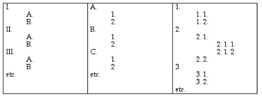 – de hiérarchisation des différentes parties du texte : numéros 1, 2, 3, ; I, II, II ; lettres A, B, C ; a, b, c.