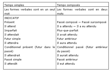 | par rapport au moment de la parole | passé surcomposé il a eu attendu | passé composé il a attendu plus que parfait il avait attendu | présent | (moi, ici, maintenant, je dis que…)futur antérieur il sera guéri | futur simple il marchera |