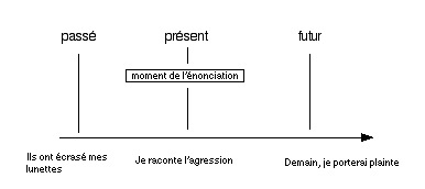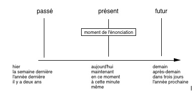 — le présent de l’émetteur, moment où celui-ci parle ou écrit, appelé moment de l’énonciation ;