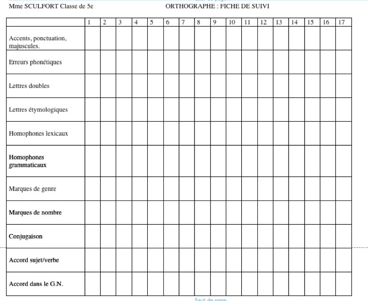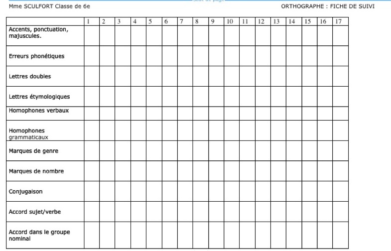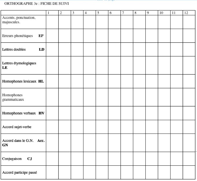 Pour rendre l’élève conscient des points à travailler en priorité et éviter qu’il ne se décourage, celui-ci sera invité à mettre une croix dans la case correspondant à ses erreurs récurrentes. Après un certain nombre d’exercices (dictées et rédactions), professeur, élève et parents pourront avoir une vision plus «scientifique» des compétences et des lacunes.